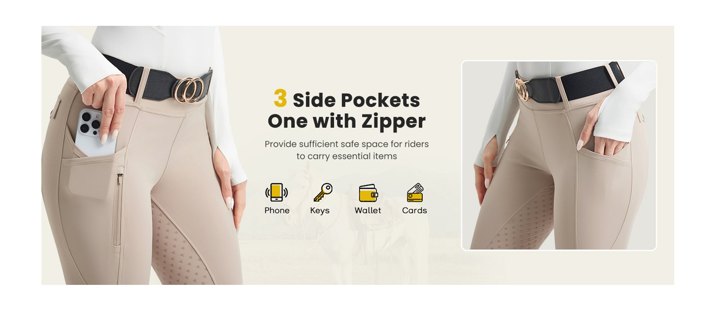 Full-seat silicone grip pattern provides extra stability and safety while riding - 3 practical side pockets (one with a zipper) and 2 stylish faux back pockets